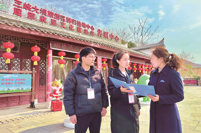 湖北省秭归县纪委监委把防治“四风”隐形变异、风腐一体问题摆在突出位置,聚焦借培训之名组织公款旅游等问题,开展明察暗访,持续加固中央八项规定堤坝。图为近日,该县纪检监察干部在屈原故里文化旅游区游客接待中心了解相关情况。郑玉涵 摄
