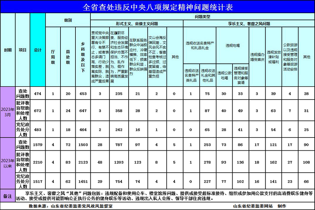 2023年以来,截至3月31日,全省查处违反中央八项规定精神问题情况如下: 下一篇:山东:瞄准靶向纠治 推进政治监督精准化 返回列表 相关文章 东昌府区:《亮剑微腐败》 ... @党员干部,你下班了,纪律规矩可没有“下班”2023/12/19 明纪释法丨文件制发搞形式主义官僚主义行为如何认定与处理?2023/10/27 中华人民共和国反有组织犯罪法2023/4/20 庆祝中国共产主义青年团成立100周年大会在京隆重举行 习近平发表重要讲话2022/5/11 电视专题片《零容忍》第五集《永远在路上》2022/1/22