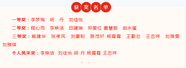 经过激烈的角逐,4号代表队荣获一等奖、2号代表队和6号代表队荣获二等奖、1号代表队、3号代表队和5号代表队荣获三等奖。此外,根据初赛成绩及个人答题情况共5人荣获个人风采奖。