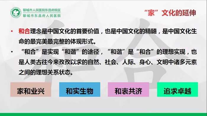 近年来,聊城市人民医院东昌府院区(聊城市东昌府人民医院)高度重视加强文化建设,凝练了以党建文化为引领、“和合文化”为主线的文化建设方向,将医院人文建设作为医院凝聚力和创造力的重要源泉,注重品牌宣传,做出诸多实践,社会知名度和行业影响力均日益凸显。